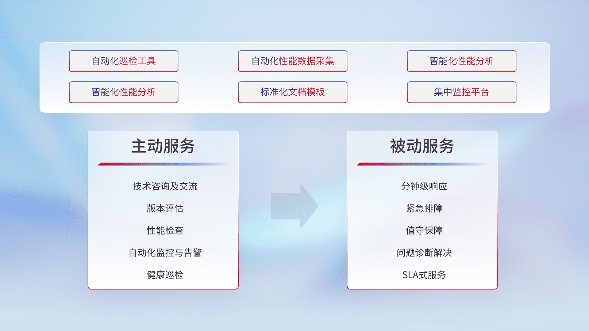 智能化工具和标准化文档,,,,保障服务质量,,,提供主动服务(包含技术咨询、、、、版本评估、、、、性能检查、、自动化监控与告警、、健康巡检)和被动服务包含(分钟级响应、、、紧急排障、、、值守保障、、、问题诊断解决、、SLA服务)。。。